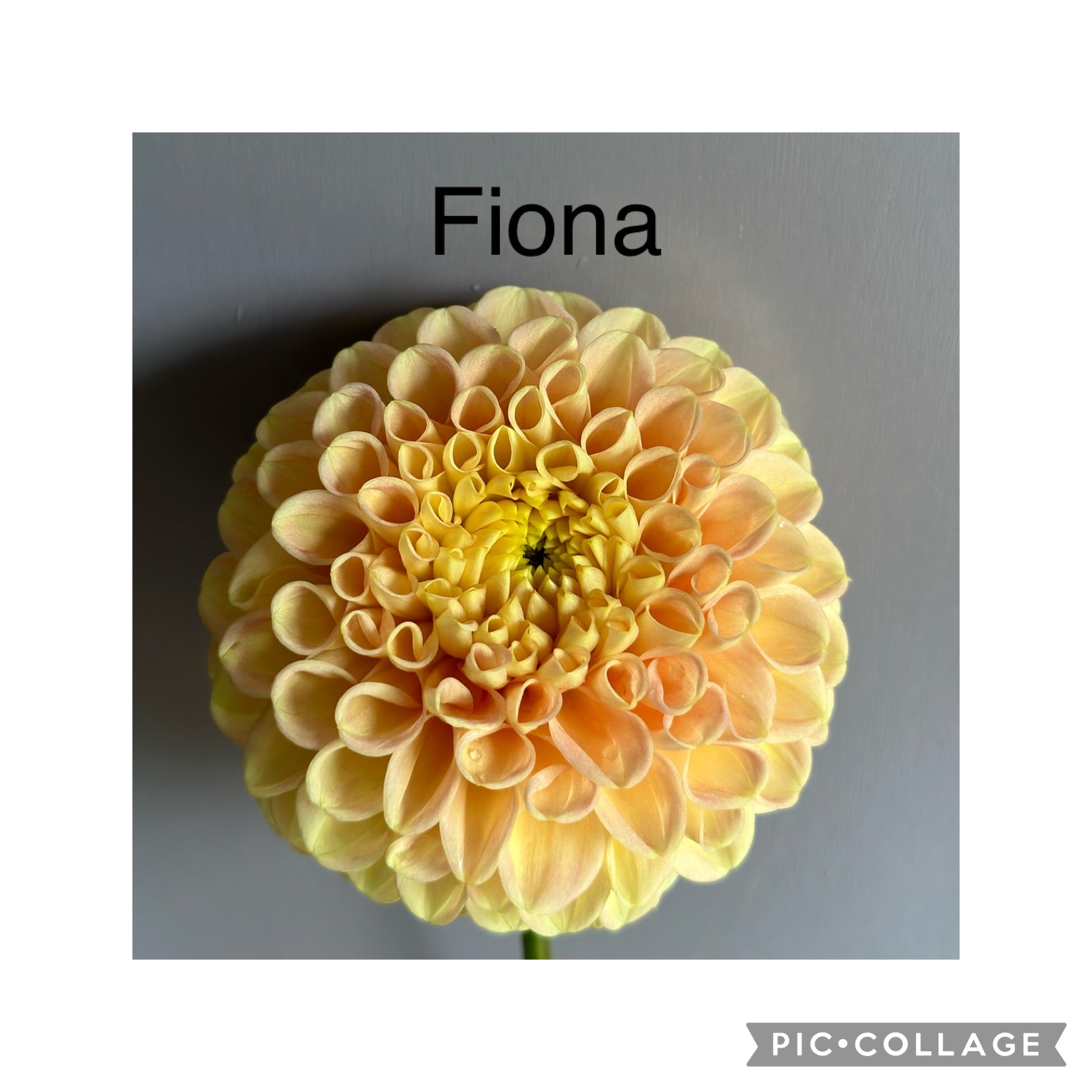 Fiona is a charming ball-type dahlia known for its soft, peachy apricot blooms with subtle yellow centers. This one seems to be a bit more muted yellow depending on weather. The flowers are compact and tightly petaled, typically measuring around 3.5 to 4 inches across, and are borne on plants that reach heights of 4 to 5 feet. This variety is prized for its excellent vase life and its ability to retain its form and color throughout the season